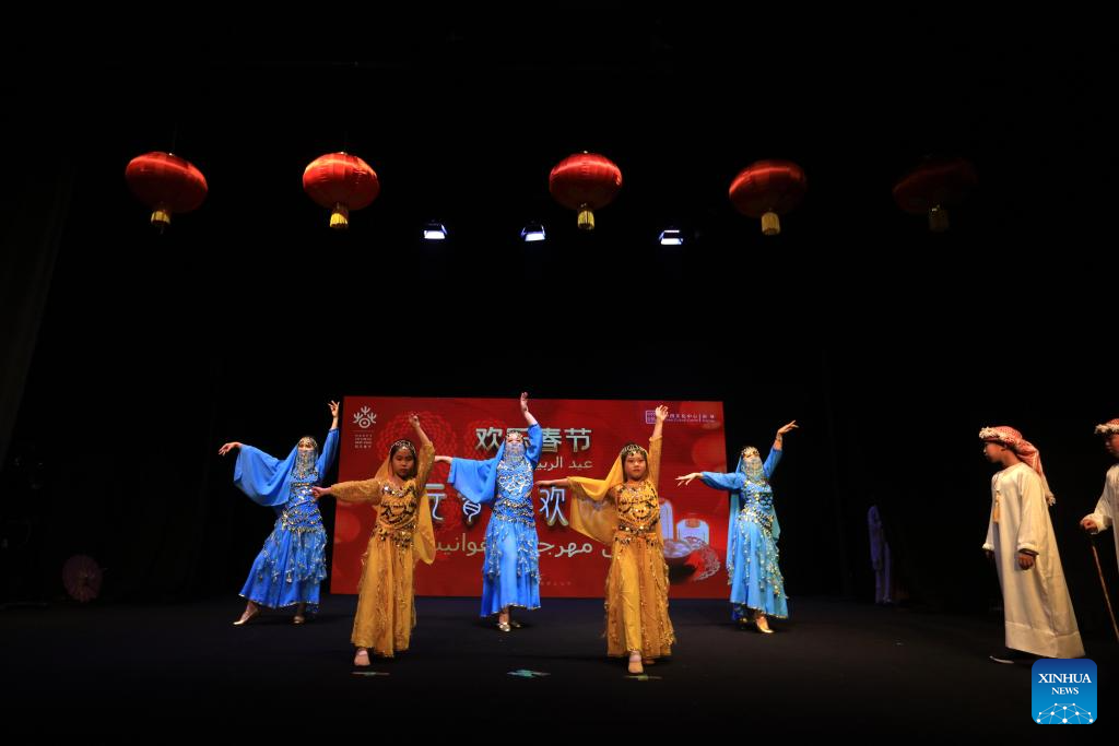 People perform an Arab dance during a Lantern Festival celebration hosted by the China Cultural Center in Amman, Jordan, on Feb. 12, 2025. The China Cultural Center in Amman hosted the Lantern Festival celebration on Wednesday, marking the end of Chinese Spring Festival festivities with traditional performances and cultural exchanges. (Photo by Mohammad Abu Ghosh/Xinhua)