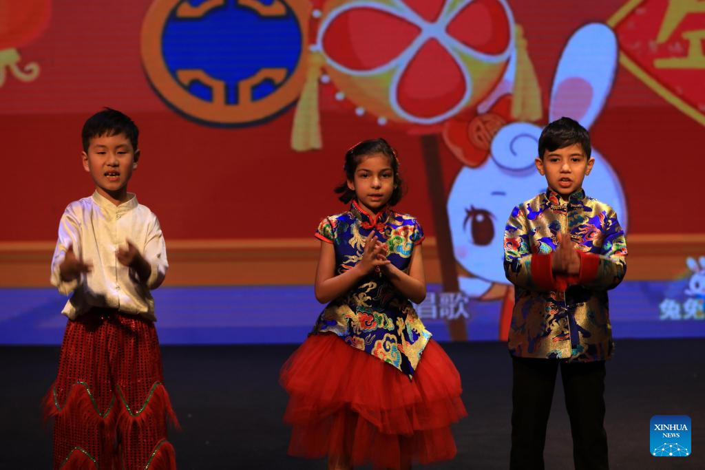 A Chinese child and Jordanian children perform during a Lantern Festival celebration hosted by the China Cultural Center in Amman, Jordan, on Feb. 12, 2025. The China Cultural Center in Amman hosted the Lantern Festival celebration on Wednesday, marking the end of Chinese Spring Festival festivities with traditional performances and cultural exchanges. (Photo by Mohammad Abu Ghosh/Xinhua)