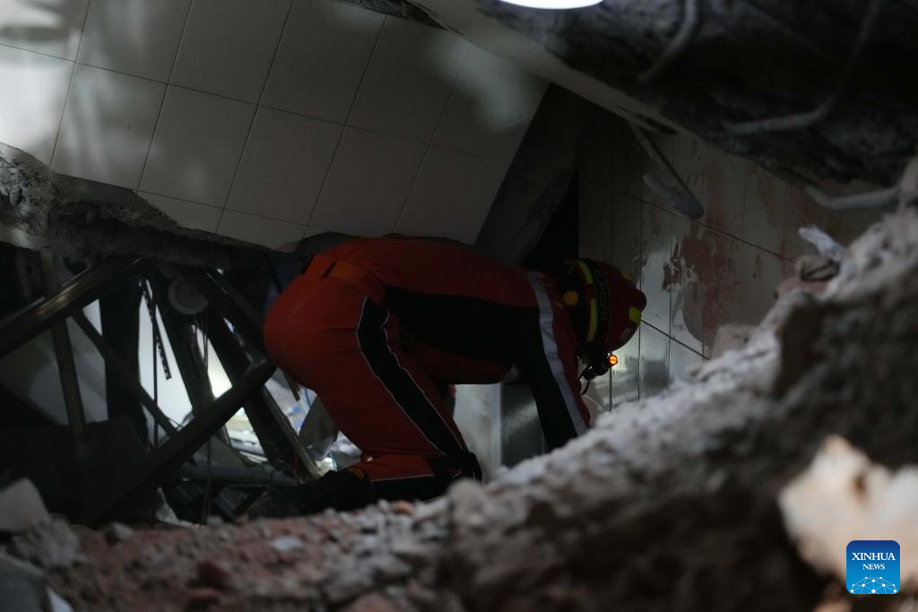 A member from the China Search and Rescue Team carries out rescue work at a quake site in Mandalay, Myanmar, March 30, 2025. Following the devastating earthquake in Myanmar, multiple Chinese rescue teams have arrived in the disaster-stricken areas, working with local responders around the clock to search for survivors.