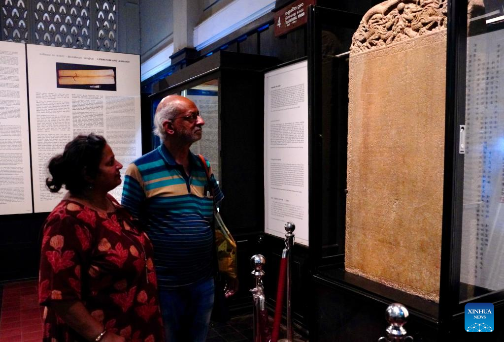 Visitors look at the Trilingual Inscription at the Colombo National Museum in Colombo, Sri Lanka, April 17, 2025. Three documentary heritage collections submitted by China have been inscribed in the UNESCO Memory of the World Register, the United Nations Educational, Scientific and Cultural Organization announced on Thursday.