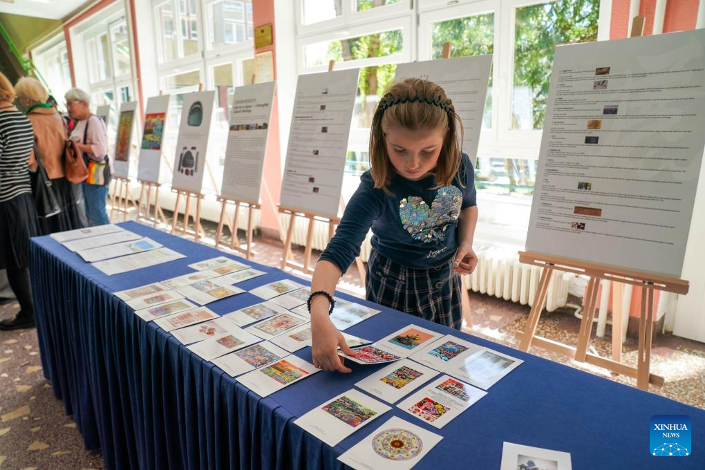 A girl looks at postcards made by Chinese farmer-artists at a Chinese folk art exhibition in Sarajevo, Bosnia and Herzegovina, April 19, 2025. (Xinhua/Yin Xiaosheng)