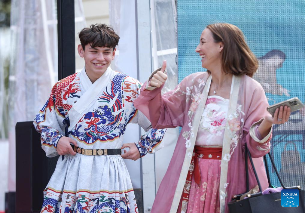 People try traditional Chinese attire during the "Tea for Harmony" cultural salon in Auckland, New Zealand, May 11, 2025. The cultural salon on tea was held on Sunday at the picturesque Howick Historical Village in New Zealand's largest city Auckland, inviting guests and local residents to immerse themselves in the richness of traditional Chinese culture while promoting dialogue and friendship between China and New Zealand. (Xinhua/Long Lei)