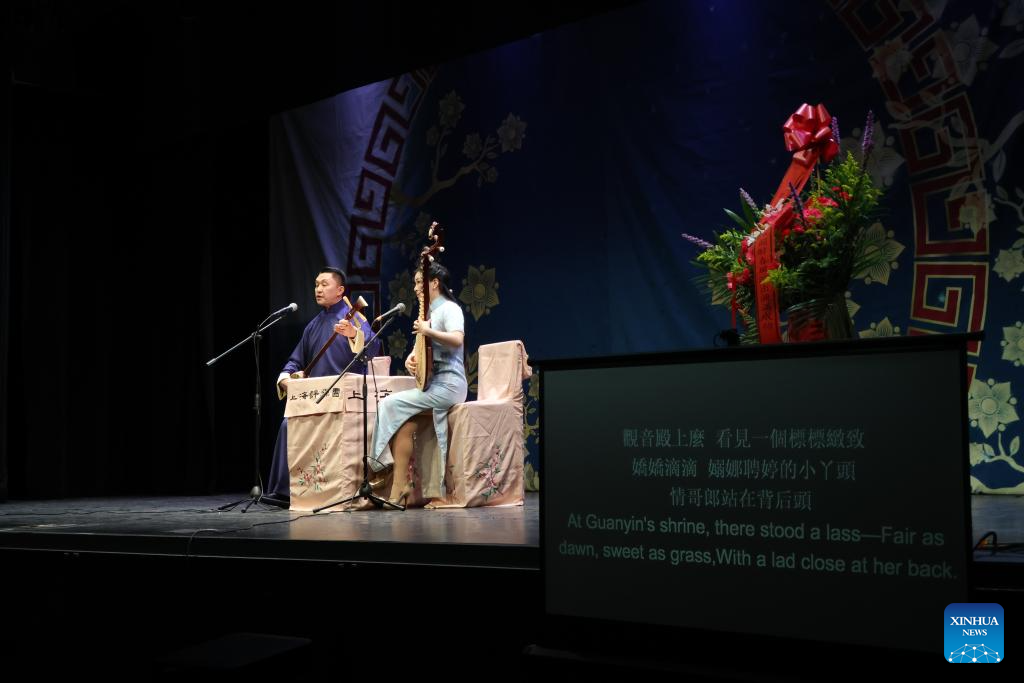 Artists from the Shanghai Pingtan Troupe perform at the Flushing Town Hall in New York, the United States, on May 11, 2025. The traditional Chinese opera art of Pingtan is once again taking center stage in the United States. The Shanghai Pingtan Troupe is touring major cities including Los Angeles, San Francisco, New York and Atlanta, with a special performance at the United Nations. This "Graceful Jiangnan in Spring Breeze" cultural exchange tour, running from April 30 to May 16, marks the troupe's second visit to the United States. (Photo by Li Xirui/Xinhua)