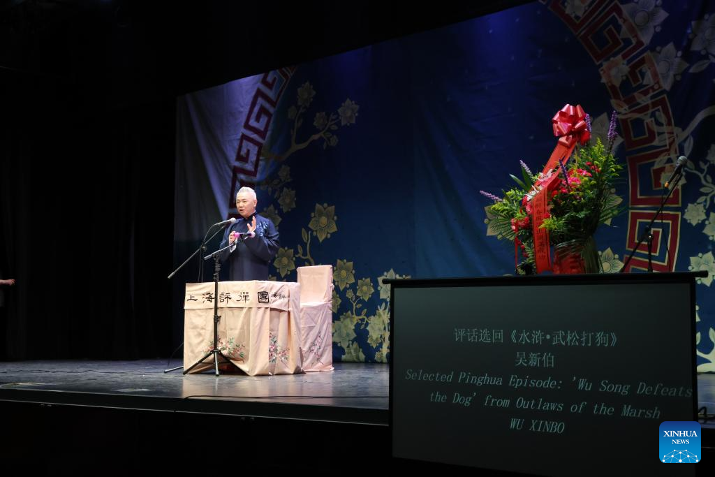 An artist from the Shanghai Pingtan Troupe performs at the Flushing Town Hall in New York, the United States, on May 11, 2025. The traditional Chinese opera art of Pingtan is once again taking center stage in the United States. The Shanghai Pingtan Troupe is touring major cities including Los Angeles, San Francisco, New York and Atlanta, with a special performance at the United Nations. This "Graceful Jiangnan in Spring Breeze" cultural exchange tour, running from April 30 to May 16, marks the troupe's second visit to the United States. (Photo by Li Xirui/Xinhua)