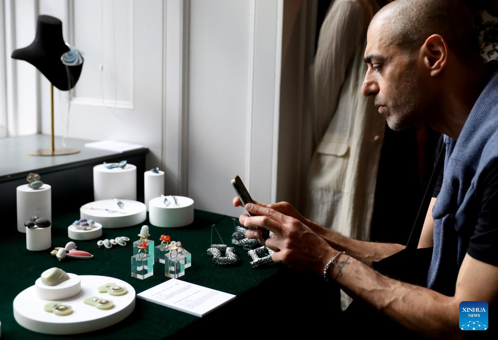 A man takes photos of the exhibits at the opening of the China National Pavilion during the 2025 London Craft Week in London, Britain, May 12, 2025. (Xinhua/Li Ying)