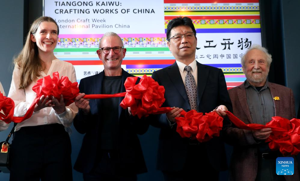 Guests prepare to cut a ribbon at the opening of the China National Pavilion during the 2025 London Craft Week in London, Britain, May 12, 2025. (Xinhua/Li Ying)