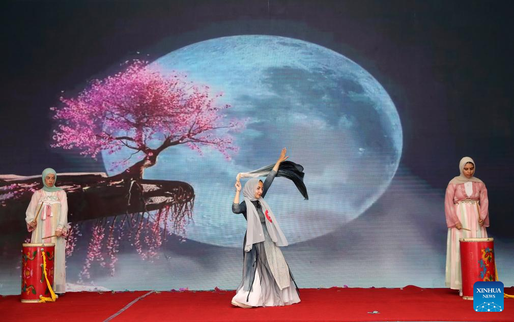 Contestants present a talent show during the 24th "Chinese Bridge" Chinese proficiency competition for Egyptian university students in Cairo, Egypt, May 17, 2025. The 24th "Chinese Bridge" Chinese proficiency competition for Egyptian university students concluded Saturday in the Egyptian capital Cairo. (Xinhua/Wang Dongzhen)