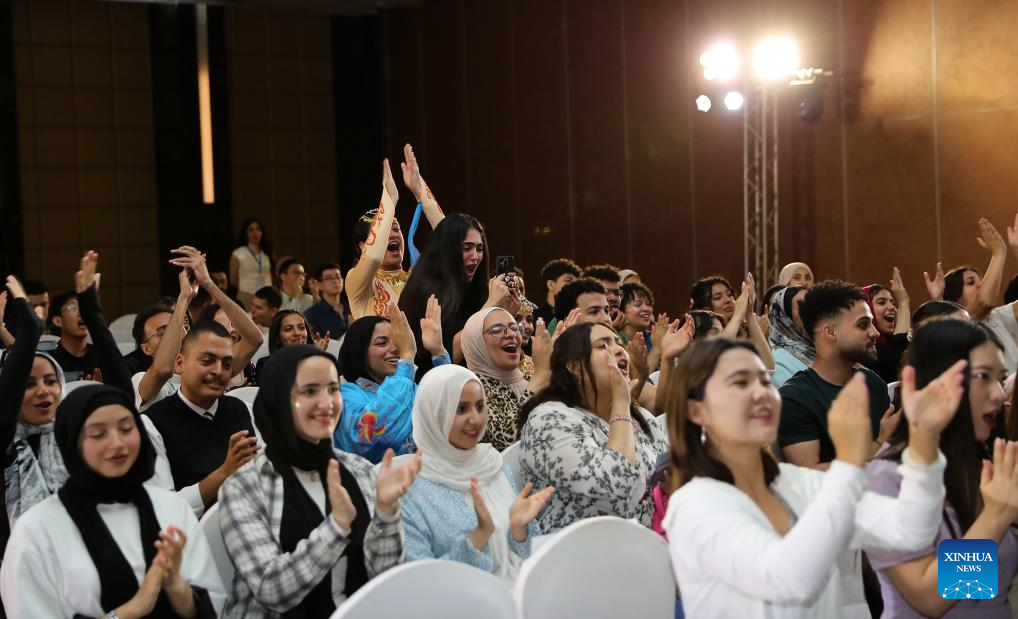 Audiences cheer for the performance of the contestants during the 24th "Chinese Bridge" Chinese proficiency competition for Egyptian university students in Cairo, Egypt, May 17, 2025. The 24th "Chinese Bridge" Chinese proficiency competition for Egyptian university students concluded Saturday in the Egyptian capital Cairo. (Xinhua/Wang Dongzhen)
