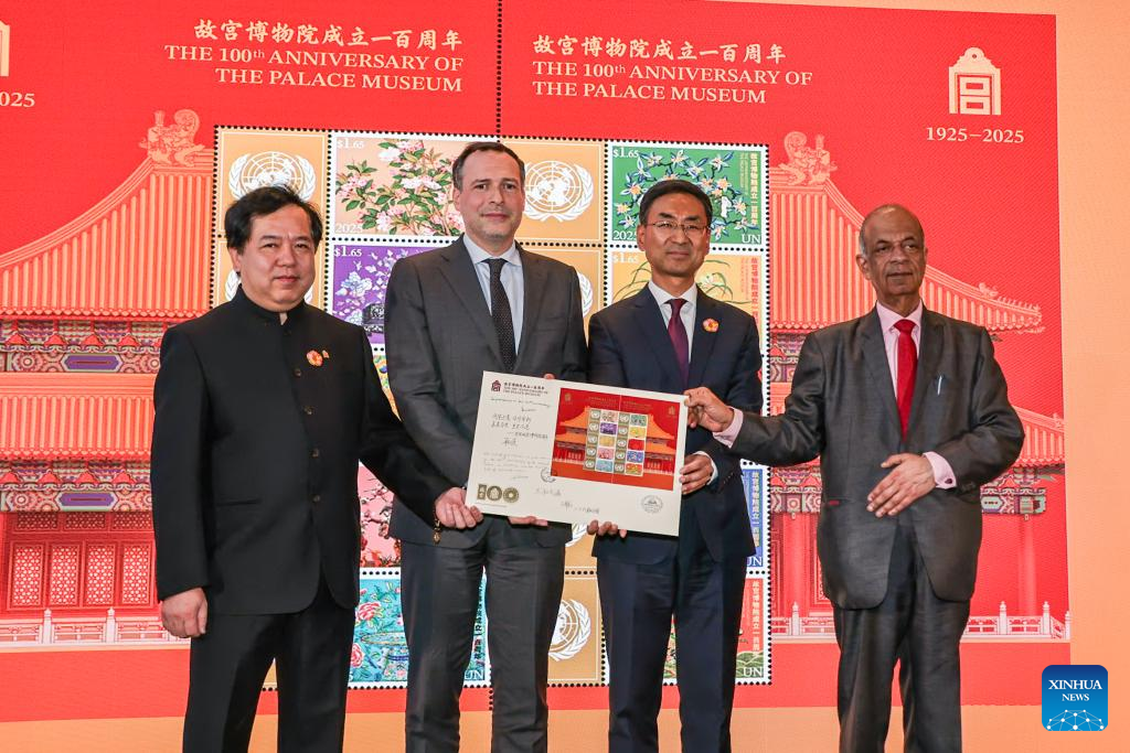 Geng Shuang (2nd R), charge d'affaires of China's permanent mission to the United Nations, UN Under-Secretary-General for Operational Support Atul Khare (1st R), Eliot Minchenberg (2nd L), director of the UNESCO Liaison Office in New York and UNESCO representative to the United Nations, and Wang Yuegong, deputy director of the Palace Museum, display a commemorative UN stamp sheet marking the 100th anniversary of the Palace Museum at the UN headquarters in New York, May 19, 2025. (Photo by Zhou Huanxin/Xinhua)