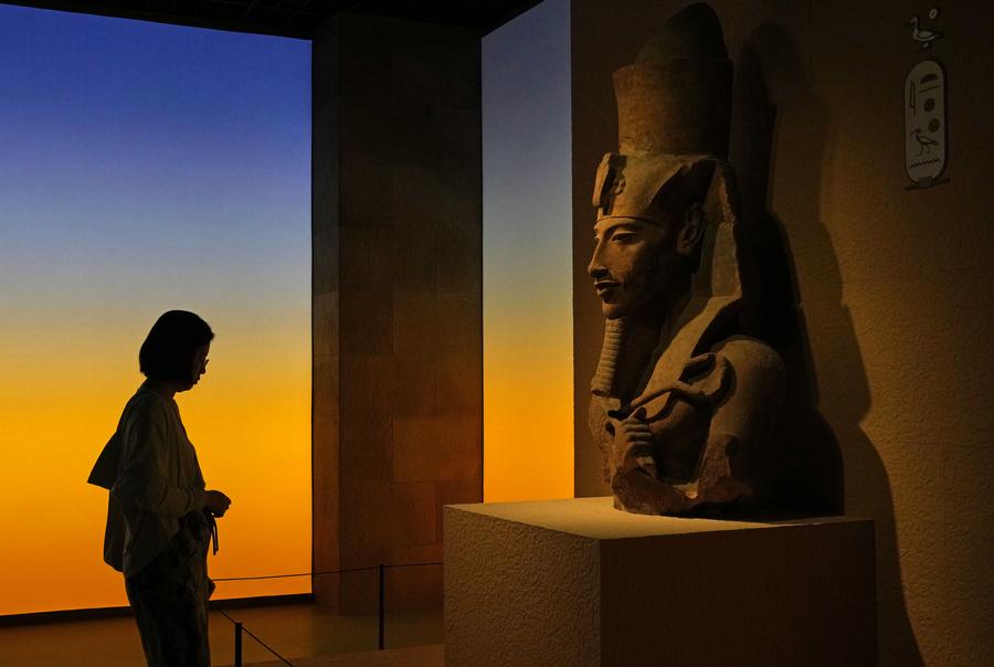A visitor views a statue of King Akhenaton during a preview of the exhibition "On Top of the Pyramid: The Civilization of Ancient Egypt" at the Shanghai Museum in east China's Shanghai, July 17, 2024. (Xinhua/Liu Ying)