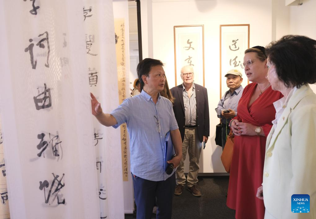 Visitors watch calligraphy works during the "Lanting Culture Salon - Chinese Calligraphy Exhibition" held in Copenhagen, Denmark, June 21, 2025. (Xinhua/Zhang Yuliang)