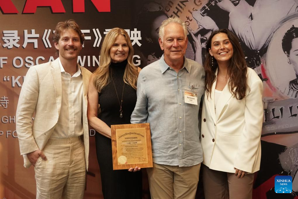 Mark Scott (2nd R), son of Rey Scott, a correspondent of the documentary "Kukan" before the screening of its newly restored version at the Academy Museum of Motion Pictures in Los Angeles, the United States, June 24, 2025. The newly restored version of the documentary "Kukan" was premiered here on Tuesday. "Kukan," meaning "bitter struggle" or "hard work" in Chinese, is an Oscar-winning documentary produced by Chinese American playwright Li Ling-Ai and filmed by American correspondent Rey Scott. (Photo by Zeng Hui/Xinhua)