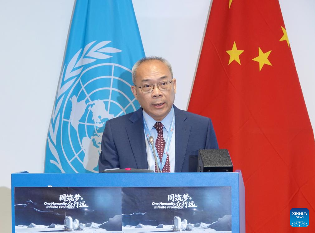 Li Song, China's permanent representative to the UN and other international organizations in Vienna, speaks at the opening ceremony of an exhibition on China's lunar exploration at the United Nations Office in Vienna, Austria, June 25, 2025. China's lunar samples, collected from both the near and far side of the moon, were exhibited together for the first time at the United Nations (UN) on Wednesday.