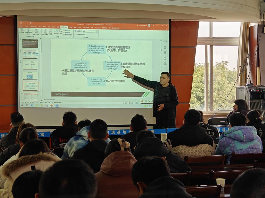 Sayed Zulfiqar Ali Shah gives training to Chinese sports coaches on sports injuries awareness and management in Qingzhen City, southwest China's Guizhou Province. (Xinhua)