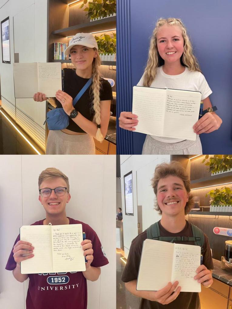 This combo photo shows students from Utah Tech University in the United States showing messages they left on a notebook after visiting the Red Star Garden in Yan'an, northwest China's Shaanxi Province, June 10, 2025. (Xinhua)