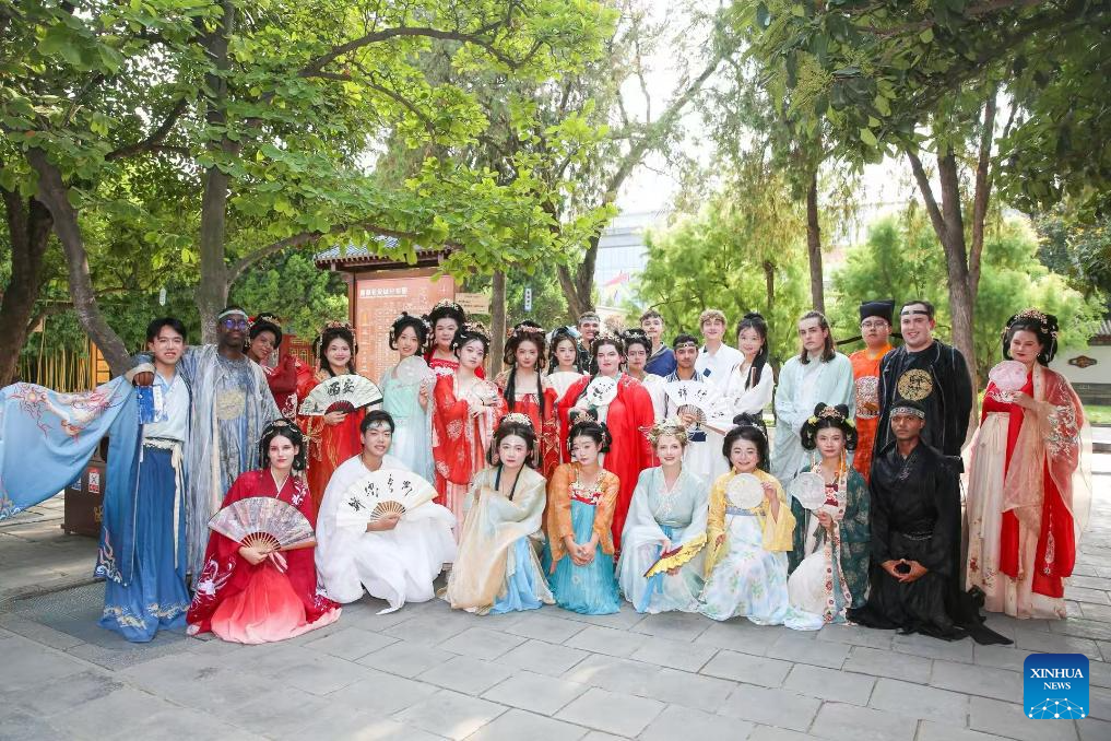 Chinese and American youth in traditional Chinese costumes pose for a group photo in Xi'an, northwest China's Shaanxi Province, July 14, 2025. (China International Communications Group Center for the Americas/Handout via Xinhua)