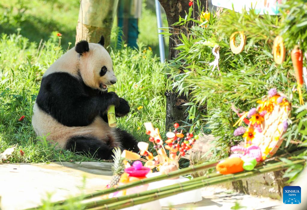 Giant panda Lin Xi enjoys a birthday meal at a giant panda conservation complex on Huaying Mountain in Guang'an City, southwest China's Sichuan Province, July 27, 2025. (Photo by Qiu Haiying/Xinhua)