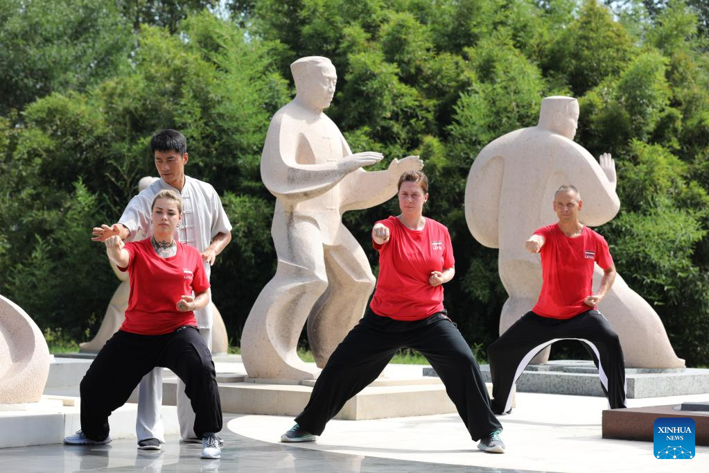 Latvian students practice Tai Chi under the guidance of an instructor at Chenjiagou Village of Wenxian County, Jiaozuo City, central China's Henan Province, Aug. 16, 2025. Twenty-nine students from Latvia are here on a 15-day program to study Tai Chi and experience the charm of Chinese martial arts.
