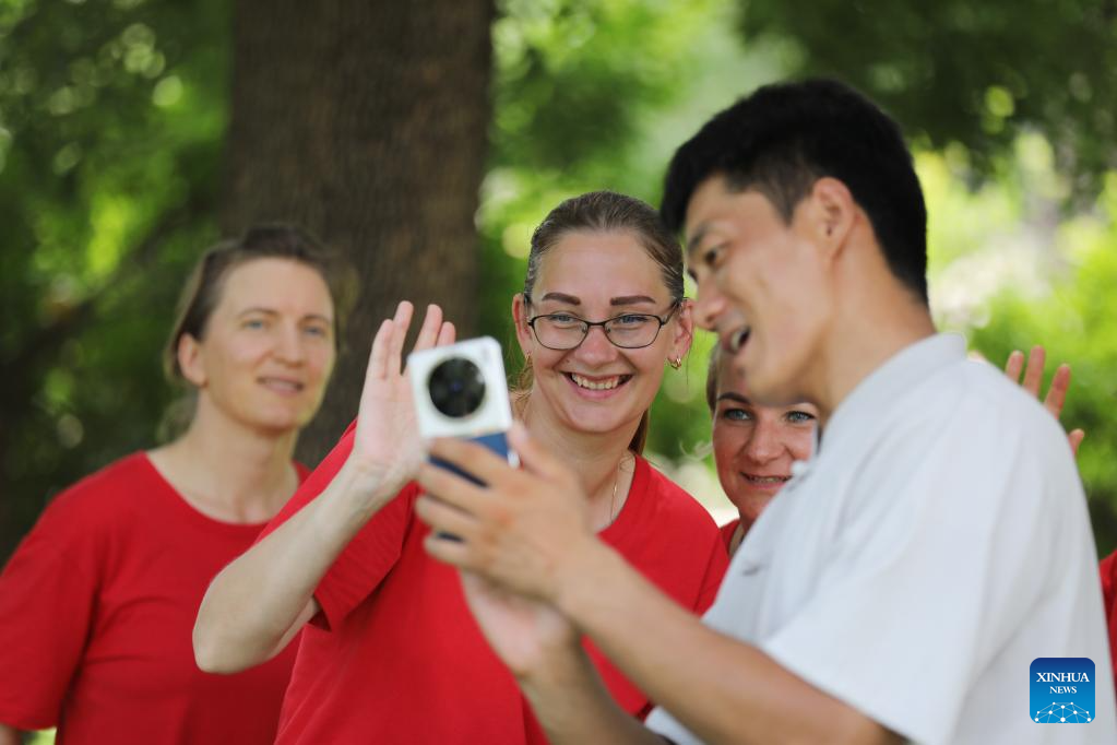 A Tai Chi instructor communicates with Latvian students at Chenjiagou Village of Wenxian County, Jiaozuo City, central China's Henan Province, Aug. 16, 2025. Twenty-nine students from Latvia are here on a 15-day program to study Tai Chi and experience the charm of Chinese martial arts.
