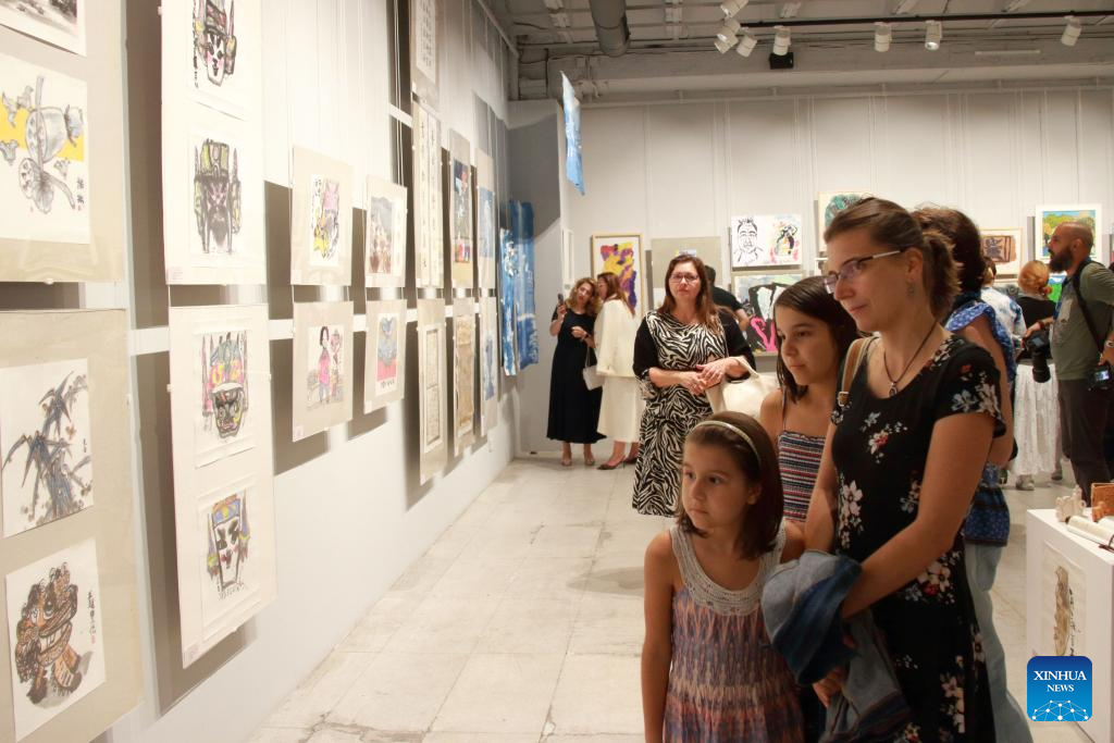 Visitors view artworks displayed at a China-Bulgaria art exhibition in Sofia, Bulgaria, Aug. 18, 2025. A joint exhibition featuring works by Chinese and Bulgarian artists opened here on Monday, highlighting cultural exchange and mutual understanding.