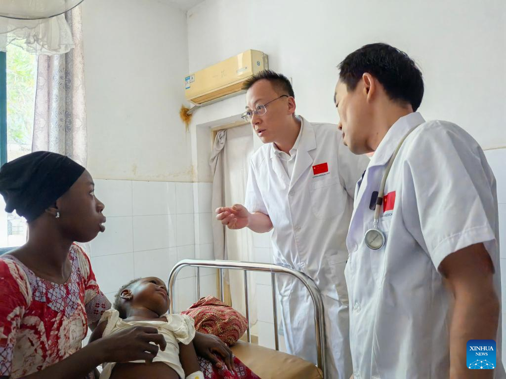 Members of the 26th batch of the Chinese medical team in Sierra Leone provide medical consultations for a child with tetanus in Freetown, Sierra Leone, on Aug. 21, 2025. (The 26th batch of the Chinese medical team to Sierra Leone/Handout via Xinhua)