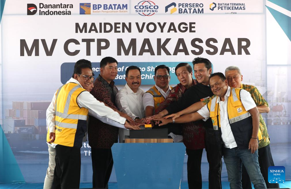 Guests attend an inaugural ceremony of a new direct shipping route from Batam to Yangpu Port in Batam, Indonesia, on Aug. 21, 2025. The voyage marked the inaugural sailing of a new direct shipping route operated by China's shipping giant COSCO from Batam to Yangpu Port in south China's island province of Hainan, enhancing sea connectivity between China and Southeast Asia. (Xinhua/Cen Yunpeng)