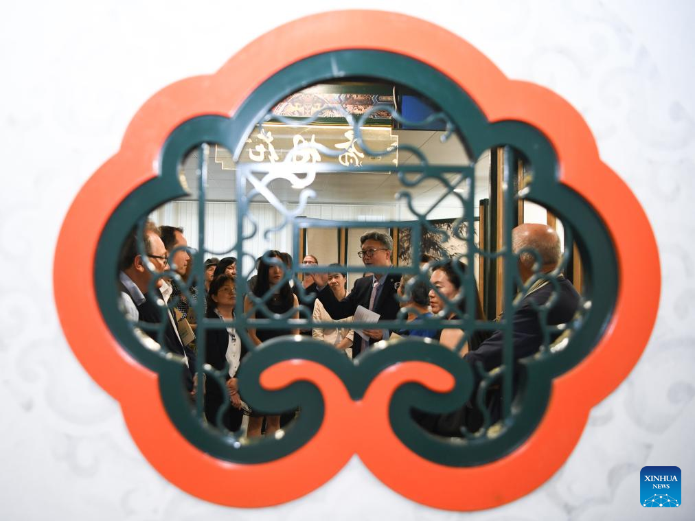 People view the exhibition "Anshan Cuijin - an Exhibition of Chinese Life Aesthetics" at the China Cultural Center in Bern, Switzerland, Aug. 22, 2025. An exhibition titled "Anshan Cuijin - an Exhibition of Chinese Life Aesthetics" kicked off Friday evening at the China Cultural Center here, attracting local and international guests to experience traditional Chinese culture infused with modern design. (Xinhua/Lian Yi)