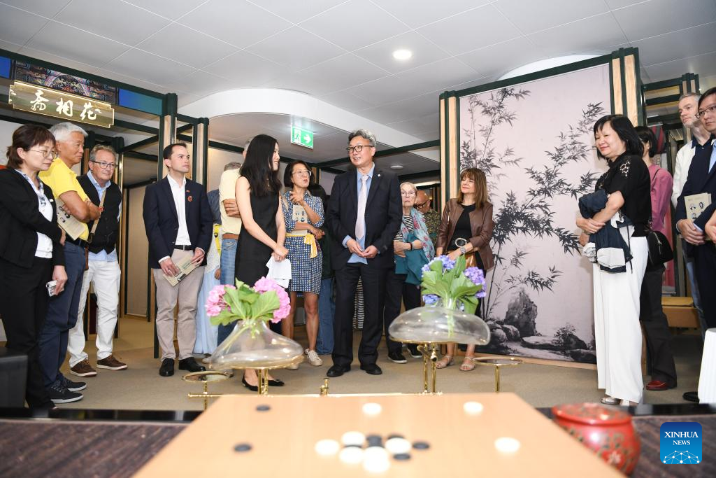 People view the exhibition "Anshan Cuijin - an Exhibition of Chinese Life Aesthetics" at the China Cultural Center in Bern, Switzerland, Aug. 22, 2025. An exhibition titled "Anshan Cuijin - an Exhibition of Chinese Life Aesthetics" kicked off Friday evening at the China Cultural Center here, attracting local and international guests to experience traditional Chinese culture infused with modern design. (Xinhua/Lian Yi)