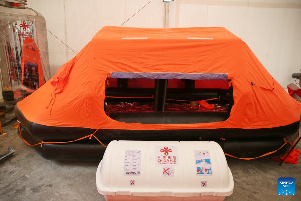 The donation includes life vests, rubber boats, life rafts, water purification units, and so on. (Photo by Habibur Rahman/Xinhua)