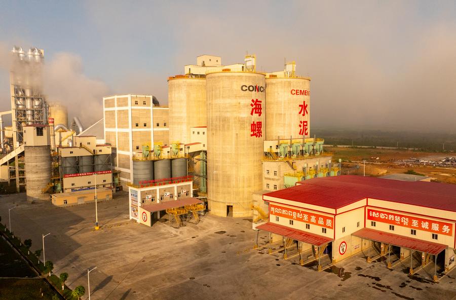 An aerial drone photo taken on May 20, 2025 shows a cement production plant jointly invested by Chinese and Cambodian investors in Kampong Speu province, Cambodia. (Photo by Nitola/Xinhua)