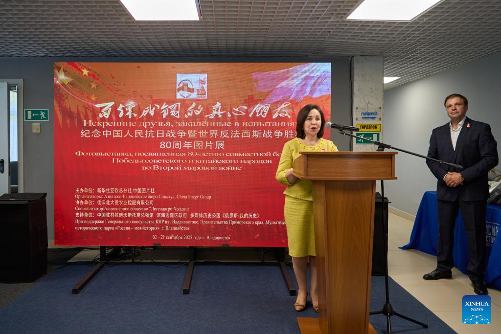 Vera Shcherbina, first vice governor and chairman of the government of Primorye Territory, addresses the opening ceremony of a photo exhibition commemorating the 80th anniversary of the victory in the Chinese People's War of Resistance against Japanese Aggression and the World Anti-Fascist War in Vladivostok, Russia, Sept. 2, 2025. (Photo by Guo Feizhou/Xinhua)