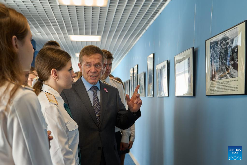 A teacher introduces a photo to students at a photo exhibition commemorating the 80th anniversary of the victory in the Chinese People's War of Resistance against Japanese Aggression and the World Anti-Fascist War in Vladivostok, Russia, Sept. 2, 2025. (Photo by Guo Feizhou/Xinhua)