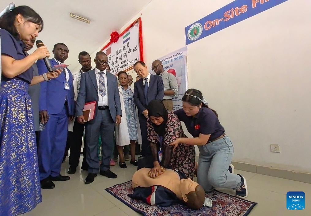 A member of the 26th batch of the Chinese medical team in Sierra Leone instructs local trainees in cardiopulmonary resuscitation (CPR) training in Freetown, Sierra Leone, Sep. 10, 2025. The first Sierra Leone-China On-Site First Aid Training Center was officially launched on Wednesday at the Sierra Leone-China Friendship Hospital in Freetown, the capital of the West African country. (The 26th batch of the Chinese medical team in Sierra Leone/Handout via Xinhua)