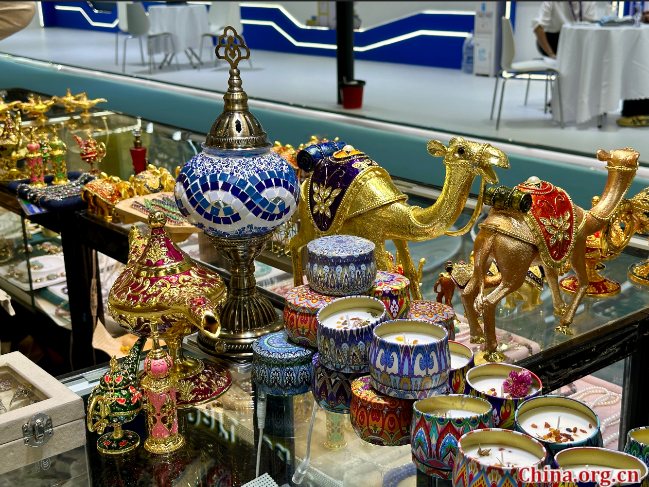 Colorful Yemeni handicrafts, including traditional lamps, camels and jewelry boxes, are displayed at the Yemeni Aladdin Handcrafts Co., Ltd. booth during the 22nd China-ASEAN Expo in Nanning, Guangxi Zhuang autonomous region, Sept. 17, 2025. [Photo by Liu Caiyi/China.org.cn]