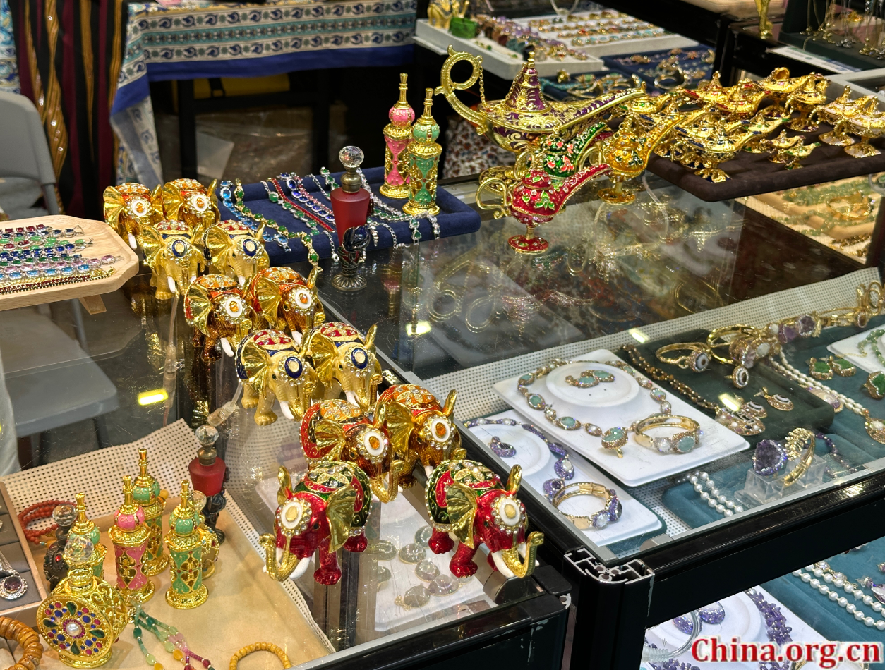 Handcrafted jewelry and ornaments from Yemen are displayed at the Yemeni Aladdin Handcrafts Co., Ltd. booth during the 22nd China-ASEAN Expo in Nanning, Guangxi Zhuang autonomous region, Sept. 17, 2025. [Photo by Liu Caiyi/China.org.cn]