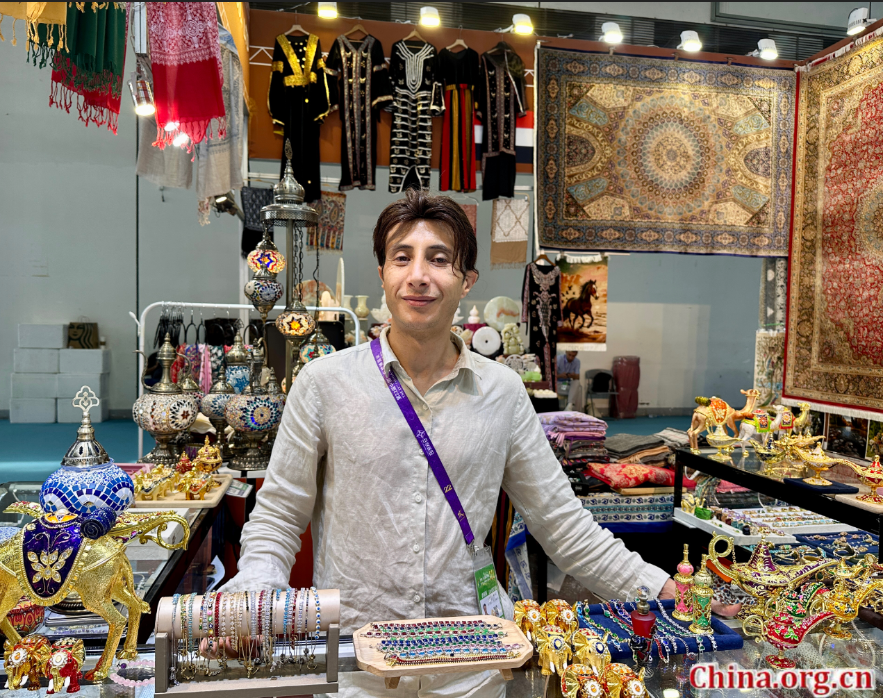 Amro Ali Baba, an exhibitor from Yemeni Aladdin Handcrafts Co., Ltd., stands at his booth showcasing traditional jewelry, lamps and perfumes during the 22nd China-ASEAN Expo in Nanning, Guangxi Zhuang autonomous region, Sept. 17, 2025. [Photo by Liu Caiyi/China.org.cn]