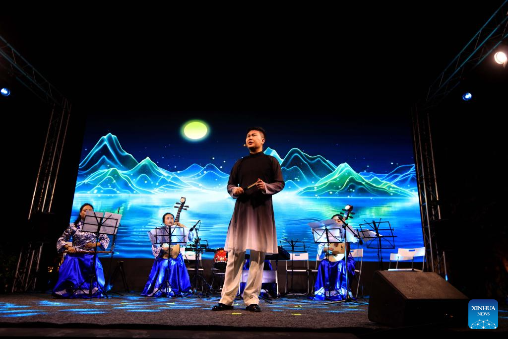 Artists perform during the 2025 "A Moment to Remember -- Mid-Autumn Chinese Folk Concert" in Amman, Jordan, on Sept. 24, 2025. The concert was staged here on Wednesday evening, offering Jordanian audiences a vibrant showcase of Chinese folk music. More than 300 delegates from both countries attended the concert. (Photo by Mohammad Abu Ghosh/Xinhua)