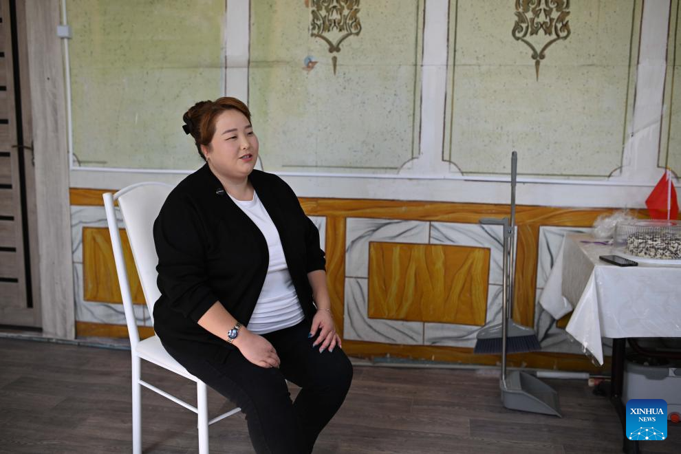 Aidai Kubanychbekova receives an interview at the "Hello, Chinese language!" learning center in Karakol, Kyrgyzstan, on Sept. 22, 2025. (Xinhua/Li Renzi)