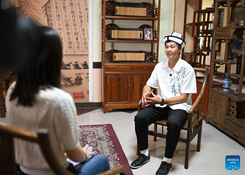 Erbol Keldibaev, a junior at Kyrgyzstan's Osh State University, receives an interview at the university's Confucius Institute in Osh, Kyrgyzstan, Sept. 18, 2025. (Xinhua/Li Renzi)