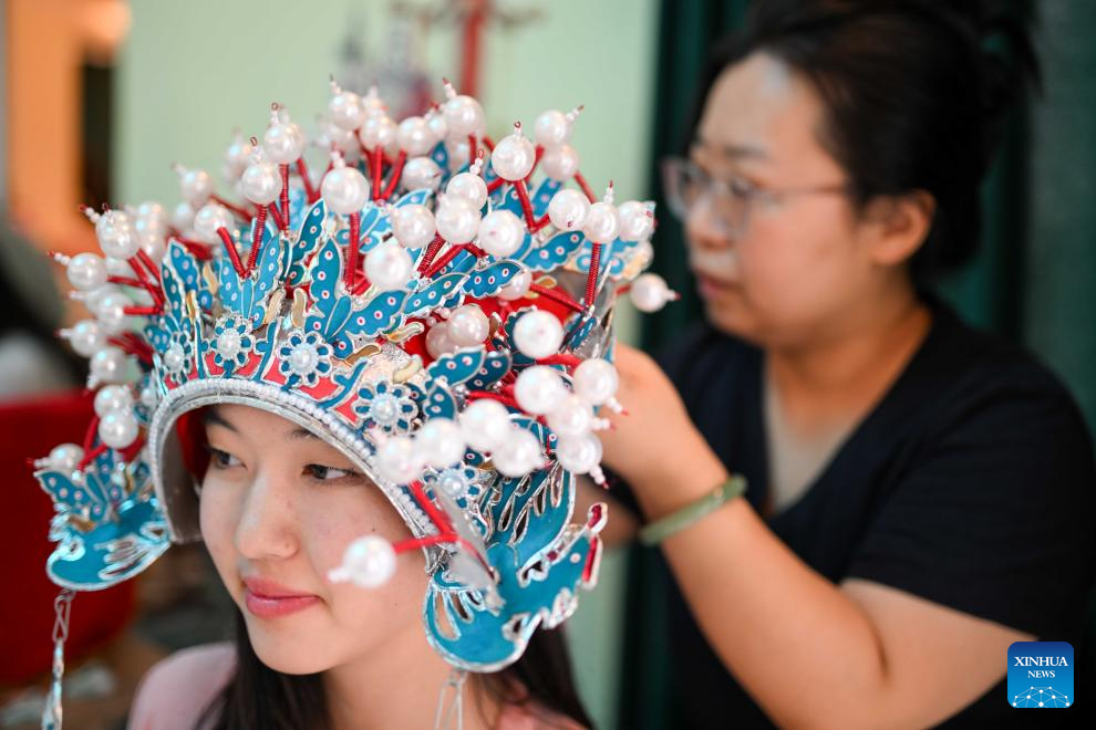A teacher helps her student put on an opera headwear at the Osh State University's Confucius Institute in Osh, Kyrgyzstan, Sept. 18, 2025. (Xinhua/Li Renzi)