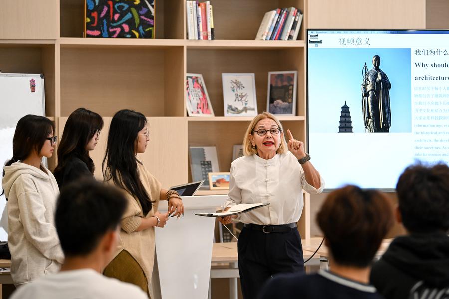 Vitomira Loncar conducts a lecture at Xi'an Eurasia University in Xi'an, northwest China's Shaanxi Province, Sept. 25, 2025. (Xinhua/Zou Jingyi)