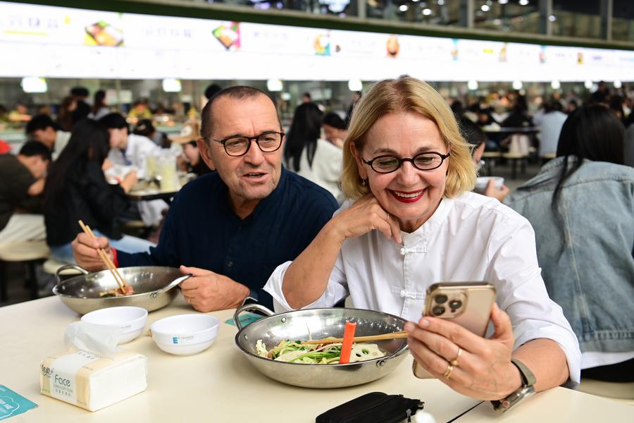 Vitomira Loncar and her husband Ivica Simic watch a video sent by their daughter while having lunch at Xi'an Eurasia University in Xi'an, northwest China's Shaanxi Province, Sept. 25, 2025. (Xinhua/Zou Jingyi)