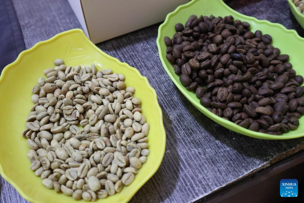 Coffee beans are displayed at Awo Coffee in Addis Ababa, Ethiopia, on Oct. 26, 2025. (Xinhua/Liu Fangqiang)