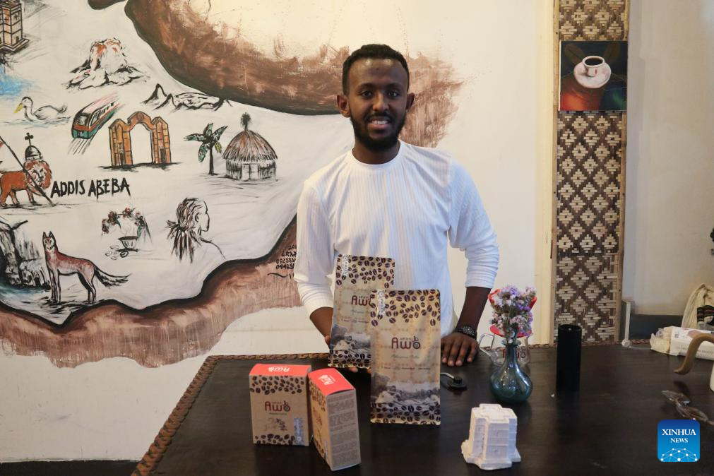 Awo Marketing Manager Kaleab Fekad demonstrates coffee products in Addis Ababa, Ethiopia, on Oct. 26, 2025. (Xinhua/Liu Fangqiang)