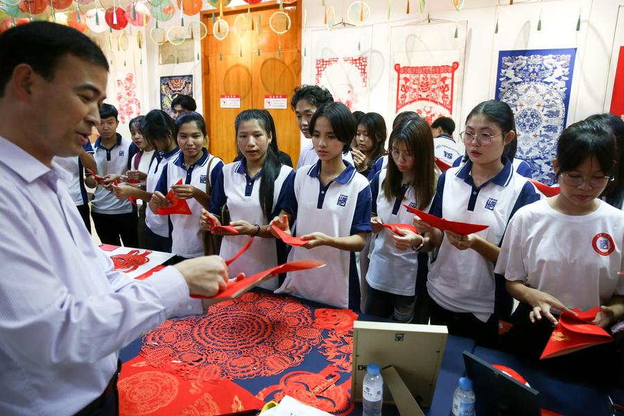Students learn Chinese traditional paper-cutting during a traditional Chinese paper-cutting exhibition at the China Cultural Center in Yangon, Myanmar, Nov. 5, 2025. (Xinhua/Myo Kyaw Soe)