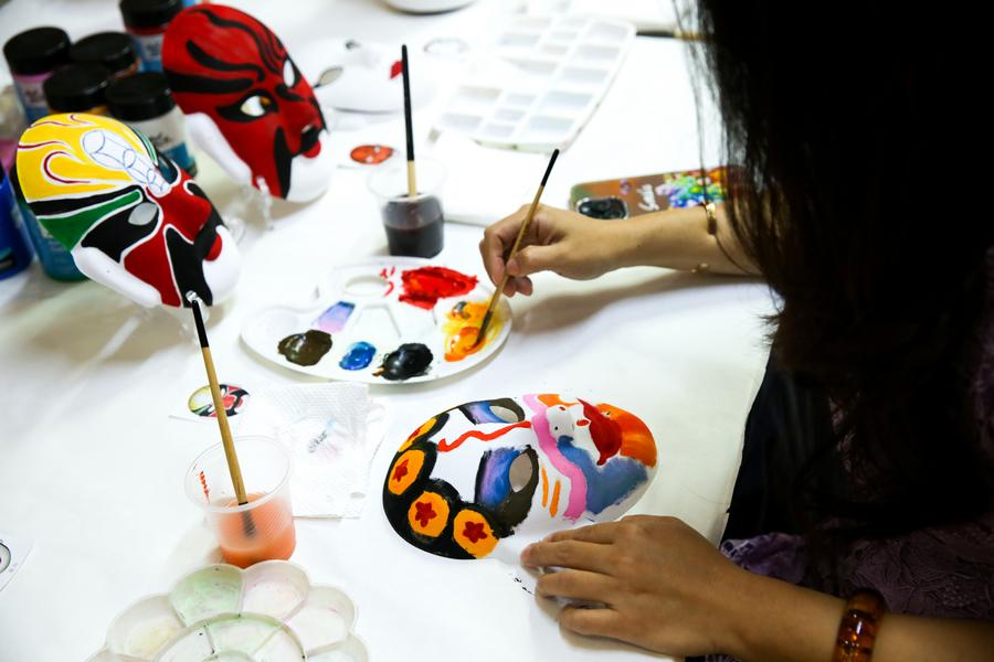 Visitors paint Chinese opera masks during a traditional Chinese paper-cutting exhibition at the China Cultural Center in Yangon, Myanmar, Nov. 5, 2025. (Xinhua/Myo Kyaw Soe)