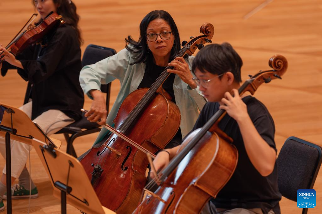 A member of the Juilliard String Quartet rehearses with students at the Tianjin Juilliard School in north China's Tianjin, Nov. 5, 2025. (Xinhua)