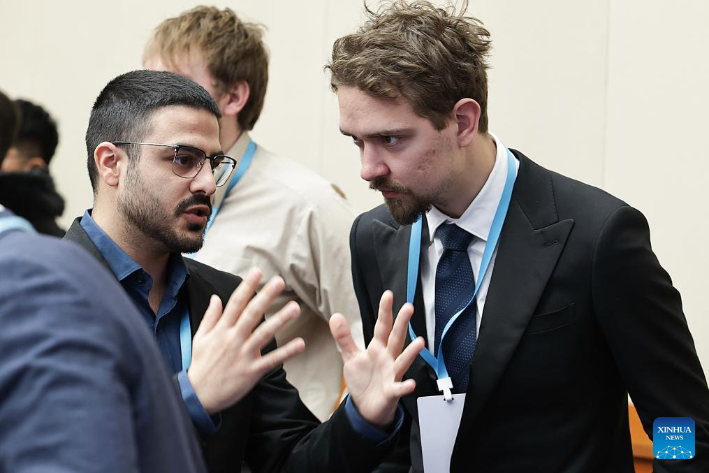 Representatives communicate with each other during the China-Europe Youth Dialogue 2025 in Beijing, capital of China, Nov. 17, 2025. The China-Europe Youth Dialogue 2025 was held here on Monday. Hosted by the Institute of European Studies of the Chinese Academy of Social Sciences, the conference has brought together 61 Gen-Z representatives from 30 European countries and about 60 students and young scholars from China -- who are exploring the theme of "China-Europe Relations in the Next 50 Years." (Xinhua/Zhang Yuwei)