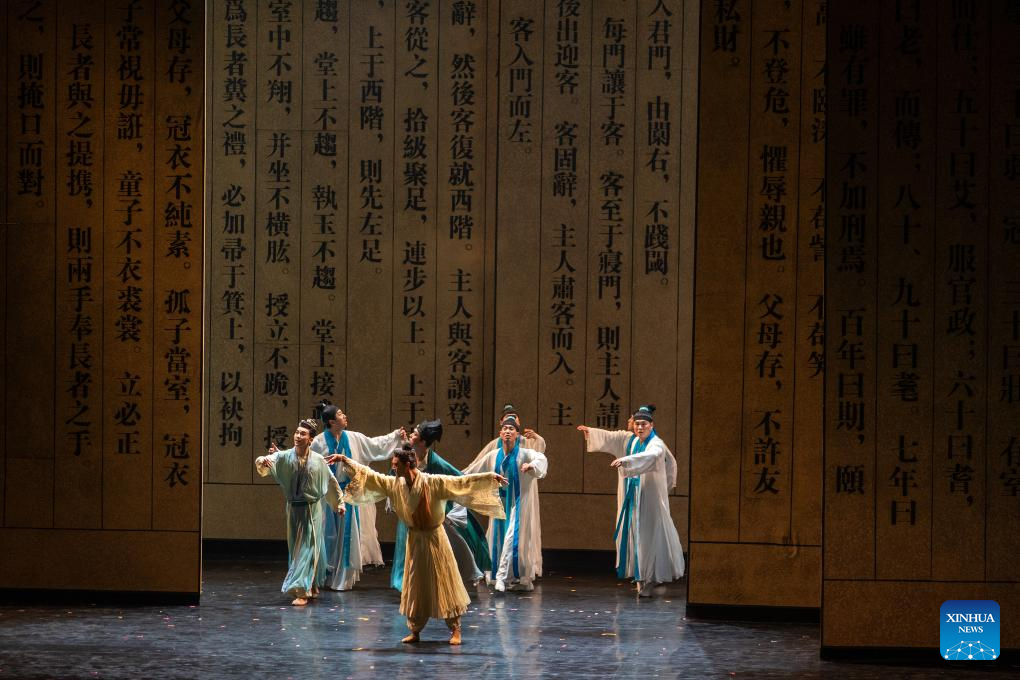 Chinese dancers stage the dance drama Tiangong Kaiwu at the Christmas Theater in Athens, Greece, Nov. 28, 2025. The epic dance drama Tiangong Kaiwu premiered to an enthusiastic reception on Friday evening at Athens' Christmas Theater, the Greek capital's largest indoor venue. (Xinhua/Marios Lolos)