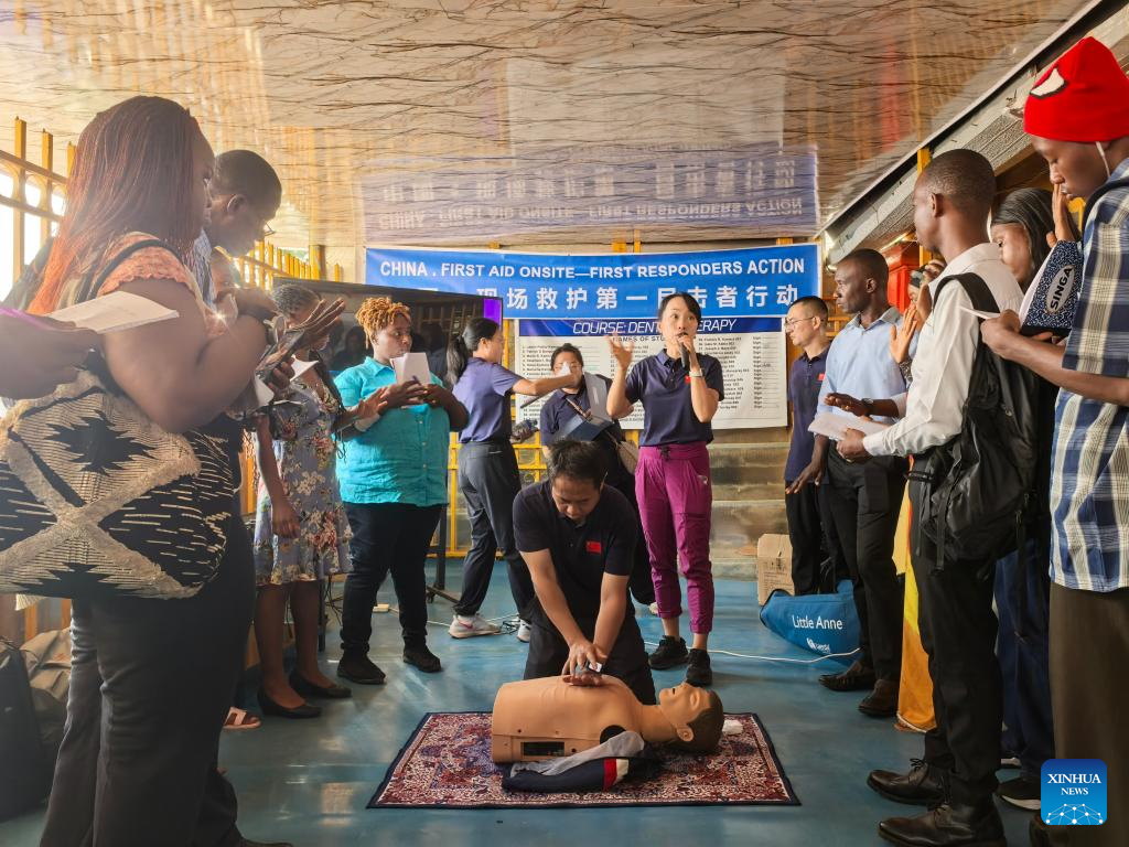 Members of the 26th batch of the Chinese medical team in Sierra Leone offer cardiopulmonary resuscitation (CPR) training to local trainees in Freetown, Sierra Leone, Dec. 11, 2025. The Chinese medical team on Thursday conducted the second-phase training under its Traditional Chinese Medicine (TCM) appropriate techniques program for medical students at the Sierra Leone Pingkang Dental College in the capital.